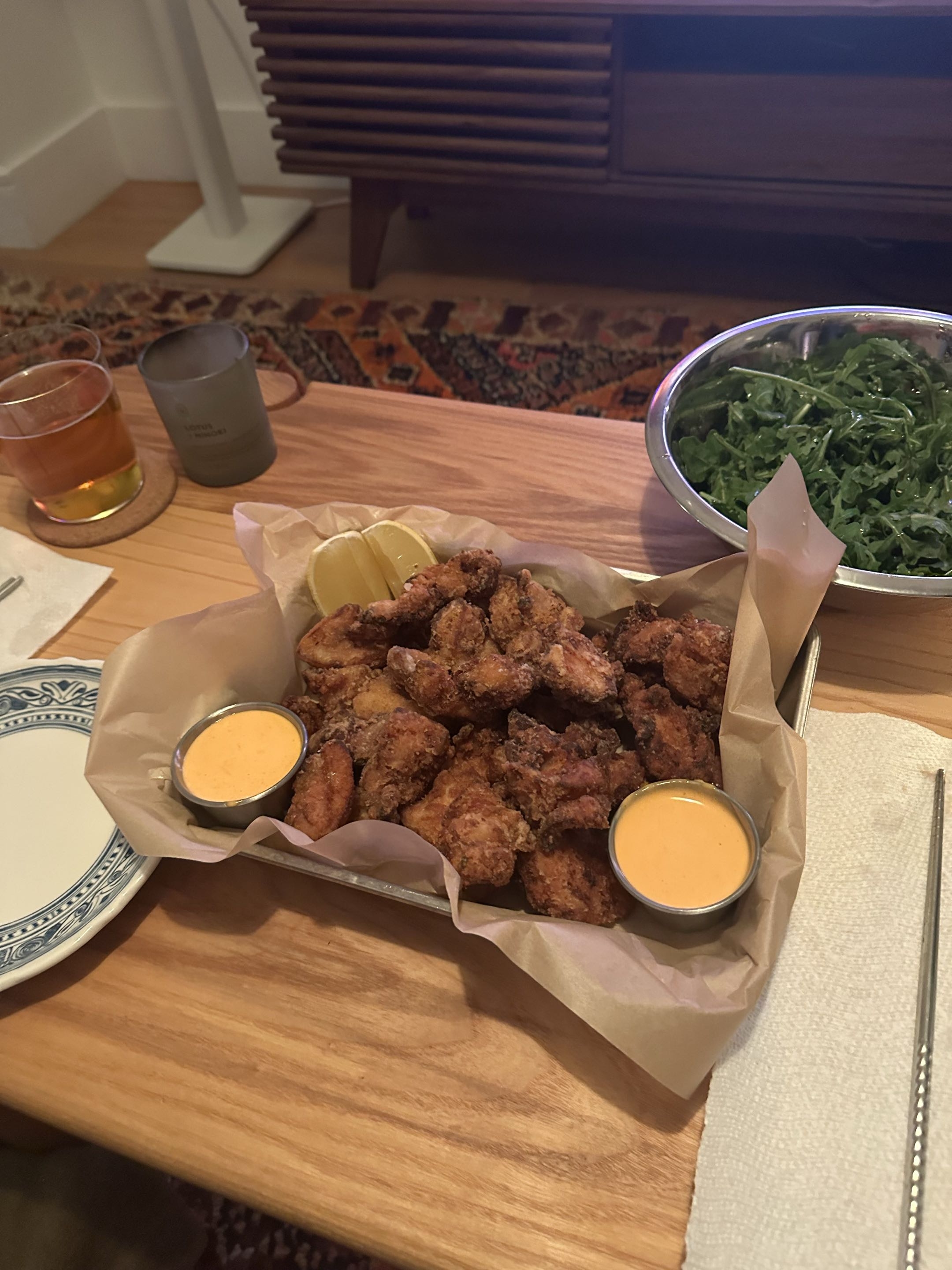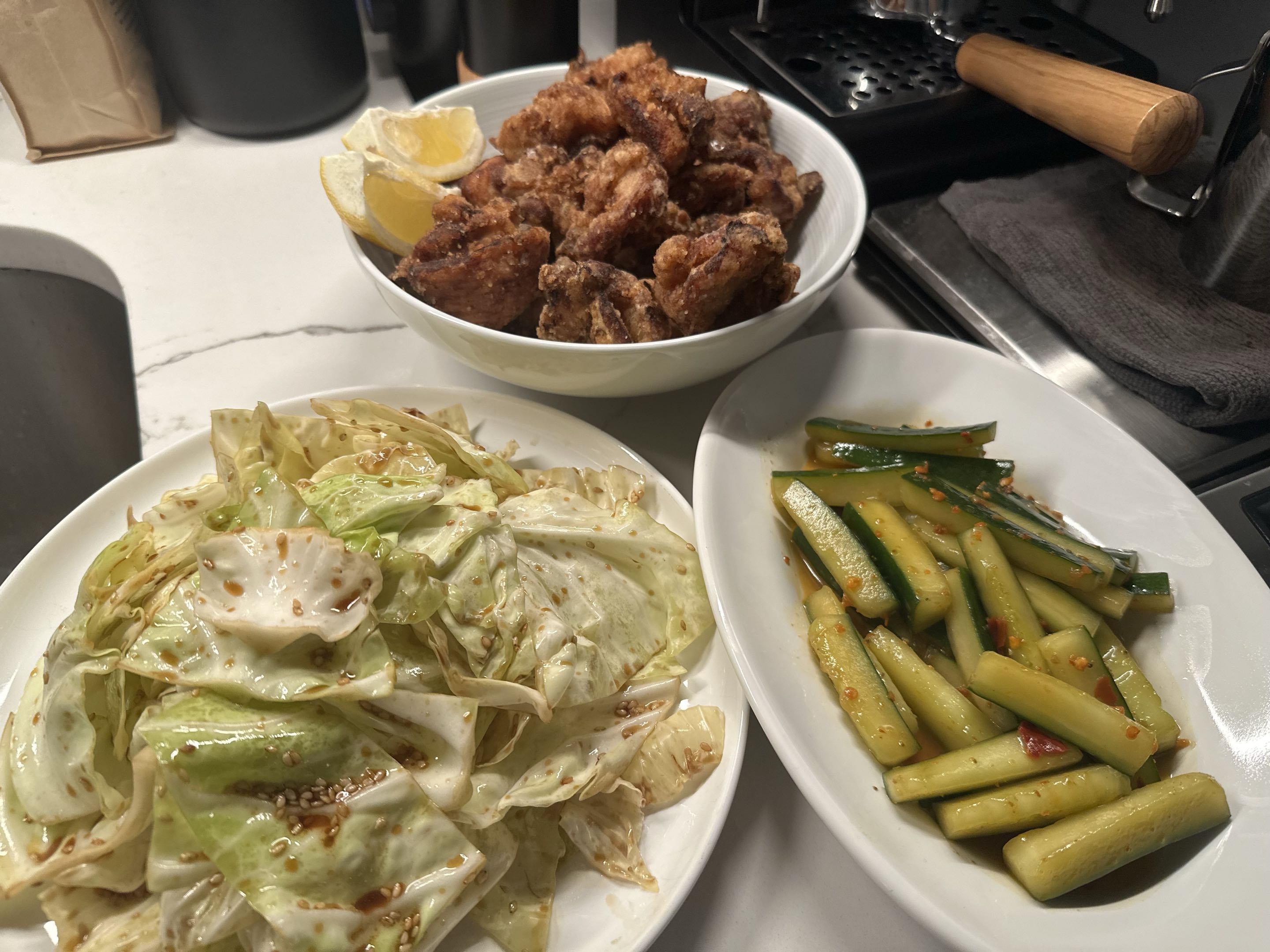 This is a recipe that has been years in the making, with many ebbs and flows to it's nature. I originally learned how to make karaage from a book by the renowned television (and restaurant) chef Morimoto in his aptly named book "Japanese Home Cooking." This was a pretty simple recipe, and likely how most people make it. Over the years I've added my own twists to it, with influence from the restaurants I've worked at, and the tastes that I've gathered with the times. I am an astoundingly lazy person and do not often find the time or willpower to do the overnight marinade and instead opt for a more powerful marinade that works in a shorter time. Sometimes I'll prep it on my lunchbreak in order to eat at dinner time. I like to accompany this dish with a cabbage salad, occasionally rice, and some sort of dipping sauce or flavorful Chinese/Japanese BBQ spice mix.